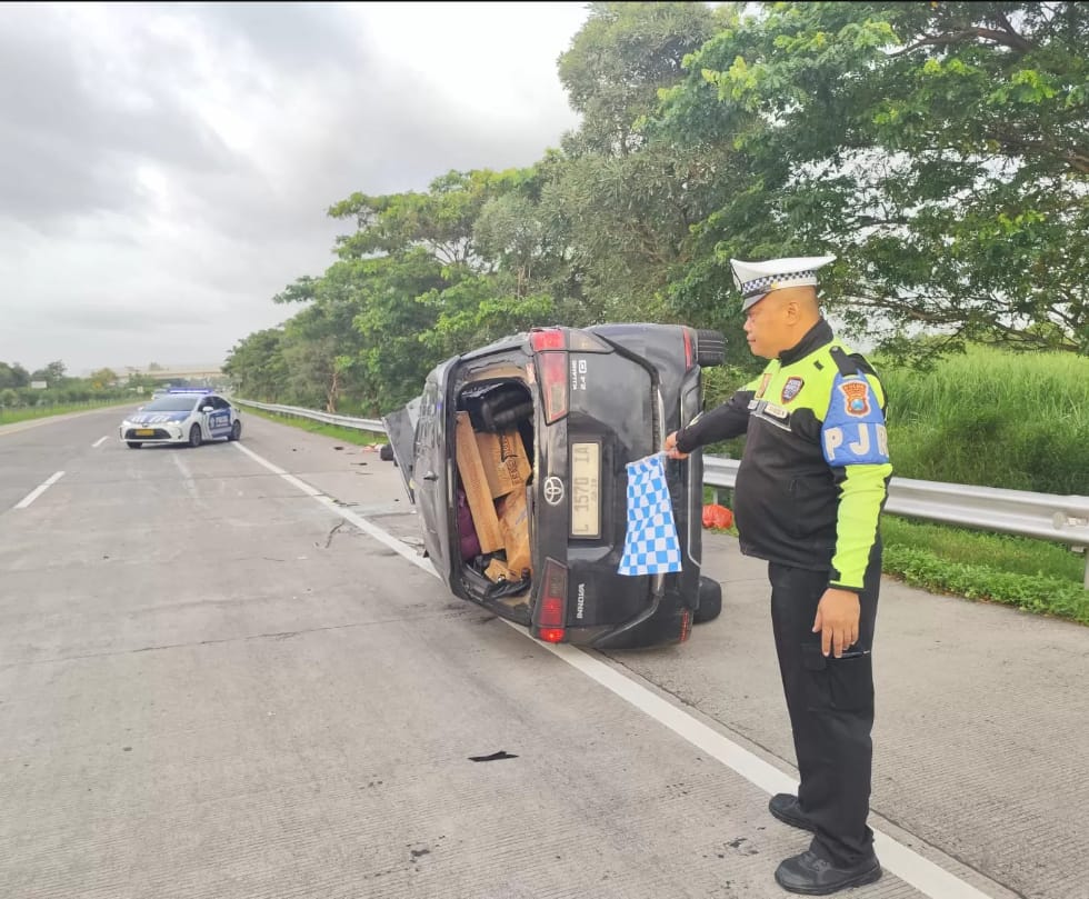 Liputanjatim.com – Kecelakaan lalu lintas tunggal terjadi di Tol Jombang–Mojokerto KM 704+600 jalur A, Sabtu (24/1/2026) pagi. Sebuah mobil Toyota Innova berpenumpang 7 orang asal Madura terguling, mengakibatkan pengemudinya luka-luka.