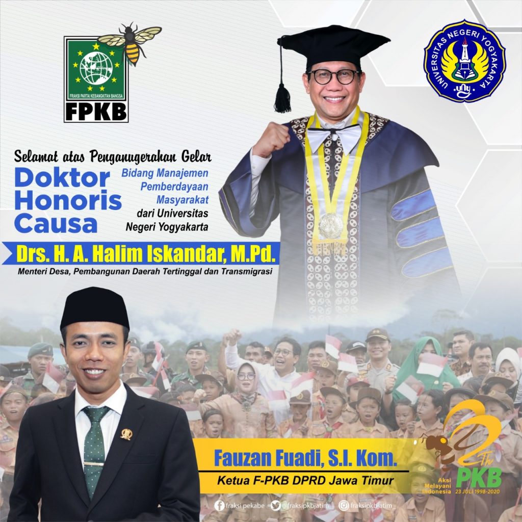 Sementara itu, Ketua Fraksi PKB Jawa Timur Fauzan Fuadi menyampaikan gelar kehormatan yang diberikan oleh UNY adalah bagian kebanggaan keluarga besar PKB.